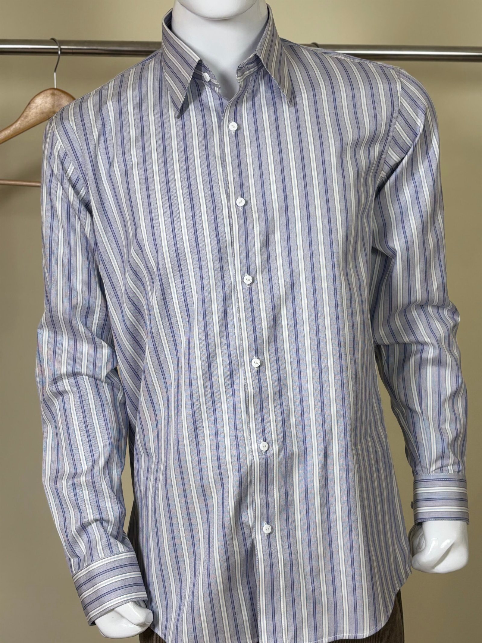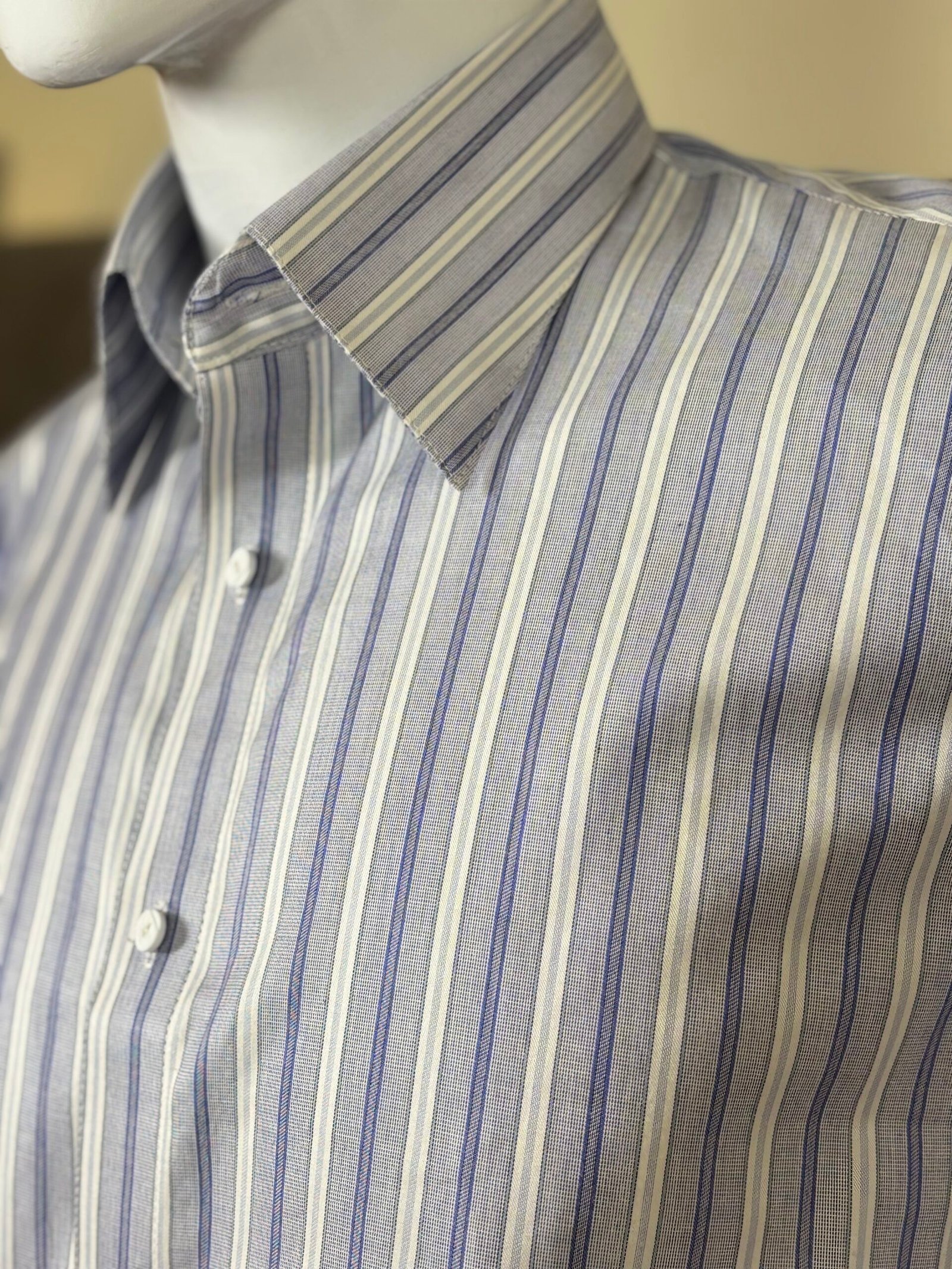 A refined men’s long sleeve shirt featuring elegant blue, grey, and white vertical stripes with a classic collar and button-front design. Perfect for formal wear, office styling, and smart casual looks.