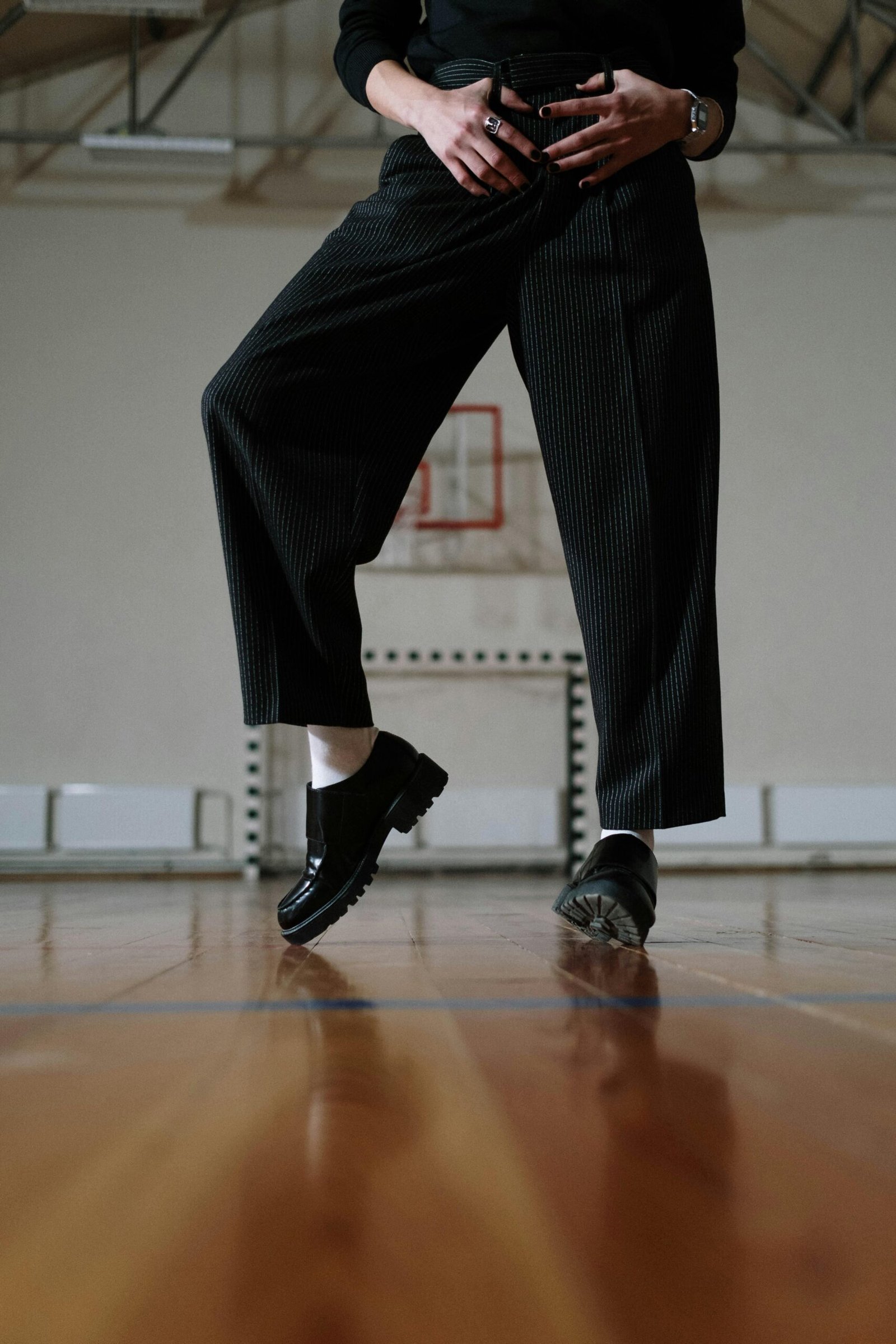 Stylish black leather shoes and pants in a gym setting with wooden flooring.Papti Classic Cream Trousers – 34″ Waist | Premium Cotton & Wool Blend