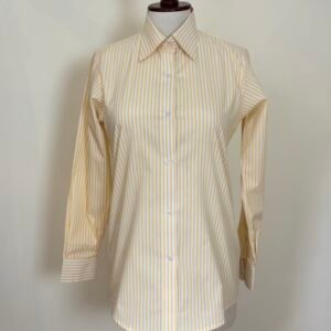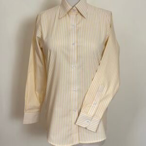 Brighten your wardrobe with this women’s yellow white striped shirt in medium. Designed with a classic pointed collar, long sleeves, and a clean button-down front, this shirt offers a polished and elegant look for both formal and everyday wear. The yellow and white vertical stripe pattern gives it a fresh and refined finish, making it easy to style with tailored trousers, skirts, or jeans for a neat and versatile outfit.